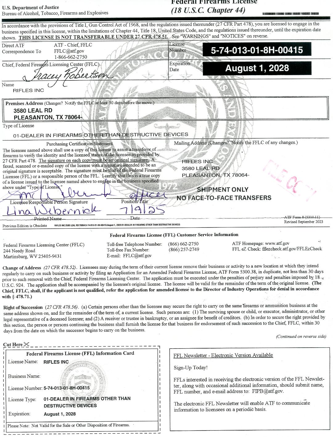 | UPS - Has recently changed shipping regulations. We have received notice that UPS will only ship firearms when an FFL dealer generates the shipping label. We have still been receiving firearms from individuals -- it is not illegal to ship an owned firearm to an FFL dealer for repair. If you do have problems with UPS accepting your firearms -- see further instructions/options below. USPS -- has not changed. USPS still allows shipment of rifles to an FFL dealer. You may want to print out a copy of our FFL (available below). What we've seen as a solution if you are having trouble with UPS acccepting shipment is having Rifles, Inc. gererate a shipping label -- which can be emailed to you. You may also choose to use a FFL dealer -- such as a local sporting goods store to ship your rifle to Rifes, Inc. If a FFL dealer ships us the rifle -- Rifles, Inc. MUST return the firearm to the dealer who shipped to us. To see UPS and FEDEX firearms policy please follow the links below.